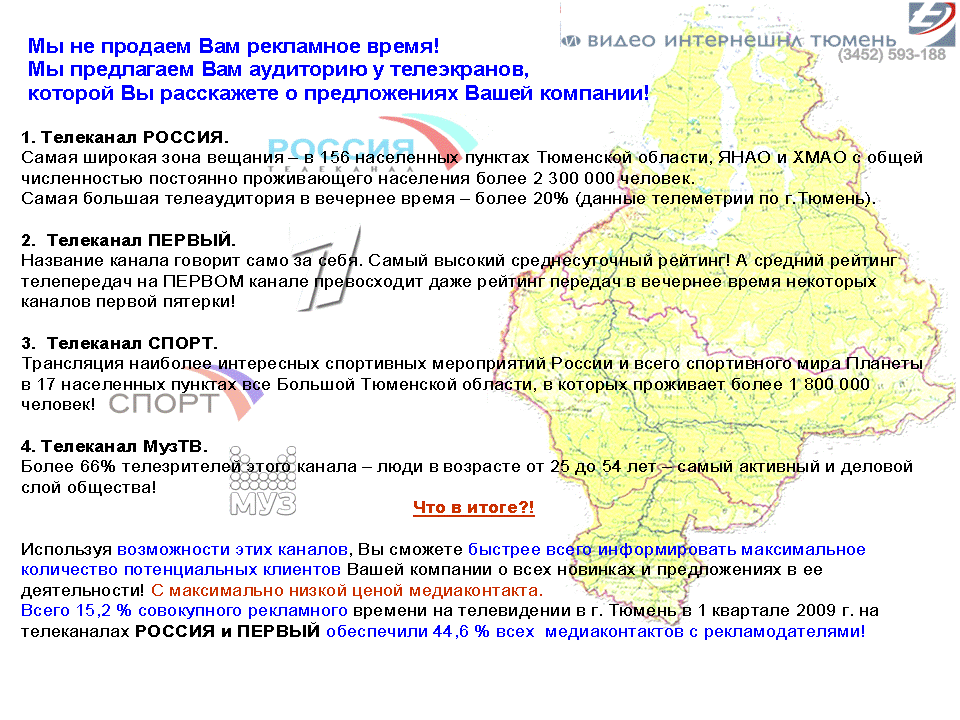 Эксклюзивный представитель центр. каналов Первый, Россия, Муз-ТВ, Спорт, Радио России в Тюменской области (ТО, в т. ч. ЯНАО, ХМАО). В управлении 4 оператора по ТО — рекламные агентства, размещают рекламу на своих территориях на каналах Первый, Россия, Спорт (Ишим, Тобольск, Нефтеюганск, Новый Уренгой) Должностные обязанности: Выполнение годового плана продаж. Планирование продаж, постановка целей по продажам. Анализ эффективности системы продаж. Активные продажи в условиях высокой конкурентной среды, работа с ключевыми клиентами, рекламными агентствами Организация работы и обеспечение функционирования дочерней компании Управление персоналом Обеспечение соблюдения финансовой политики, корпоративных стандартов компании Мониторинг и анализ рынка рекламы на вверенной территории Поддержание имиджа компании на рынке через качество обслуживания клиентов Проведение переговоров с клиентами и построение долгосрочных отношений с ними Контроль исполнения бюджета компании Достижения: На 5% до 38% увеличила долю рынка по г. Тюмени Развитие бизнеса компании: в феврале 2009г. запустила продажи канала «Спорт» в Тюменской области Провела позиционирование компании как эксперта-медиаселлера на рынке ТВ-рекламы; улучшен имидж (возврат утраченных позиций); проведены результативные PR-мероприятия (конференции, бизнес-завтраки), внедрены эффективные маркетинговые коммуникации Развила операторскую сеть: в 2009 г. подключила нового оператора в Новом Уренгое, увеличила в 2009г. продажи на 20% по всем операторам, добавила в 2009г. канал «Спорт» оператору Тобольска Перевыполнила План продаж январь-июль 2009г. на 3%, сэкономила расходы офиса на 15% Удачная проверка отделом финансового мониторинга Разработала, внедрила коммерческую политику (ценообразование, пул клиентов, стратегия продаж), бизнес-процессы Сформировала боевую команду менеджеров активных продаж, подобрала персонал бэк и фронт офисов, в т. ч. ключевых сотрудников (коммерческий директор, главный бухгалтер, маркетолог)